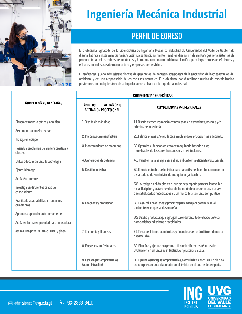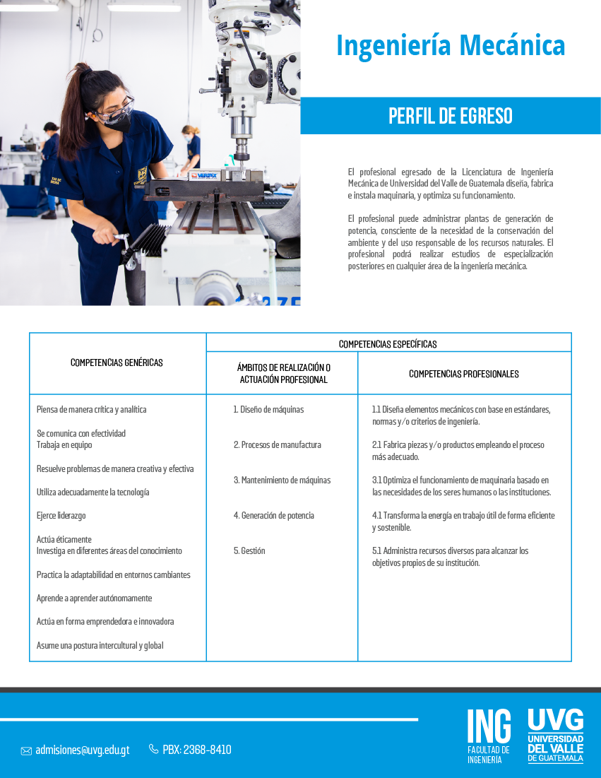 Ubicados en el nuevo Centro de Innovación y Tecnología (CIT) de UVG, los laboratorios utilizados por estudiantes del Departamento de Ingeniería Mecánica ocupan más de 1,000 metros cuadrados y ofrecen diversidad de equipos y tecnologías para fabricación de productos y piezas mecánicas, así como también para análisis de materiales, vibraciones mecánicas o herramienta de cualquier tipo, lo cual facilita el aprendizaje práctico y la elaboración de proyectos diversos durante sus estudios.