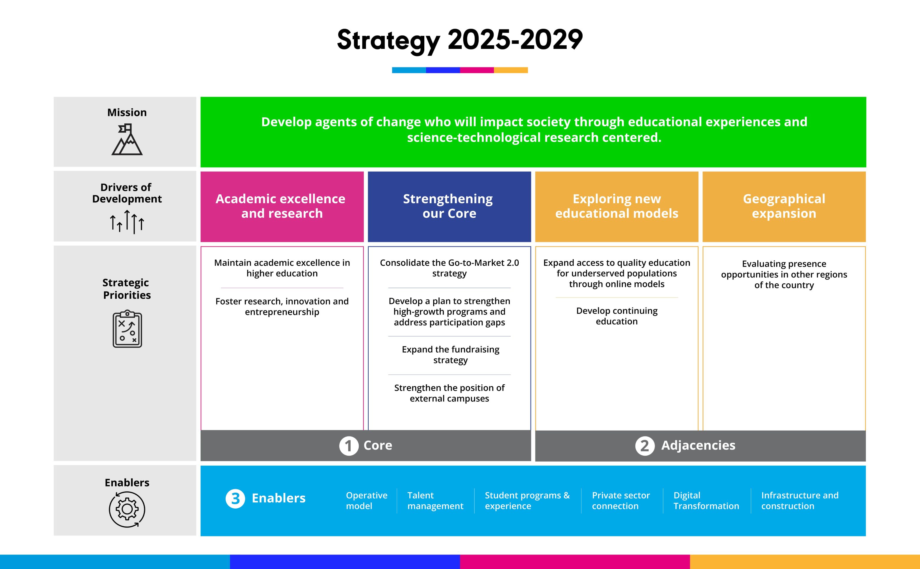 Supported by our academic excellence and our commitment to society, we will deepen our efforts in teaching, research, and outreach, fostering a dynamic ecosystem of entrepreneurship and innovation. We will strengthen our impact by enhancing our programs to make them even stronger and more competitive, diversifying our methods, expanding us to new targets, and increasing our capacity to address societal needs while promoting greater access to quality education.